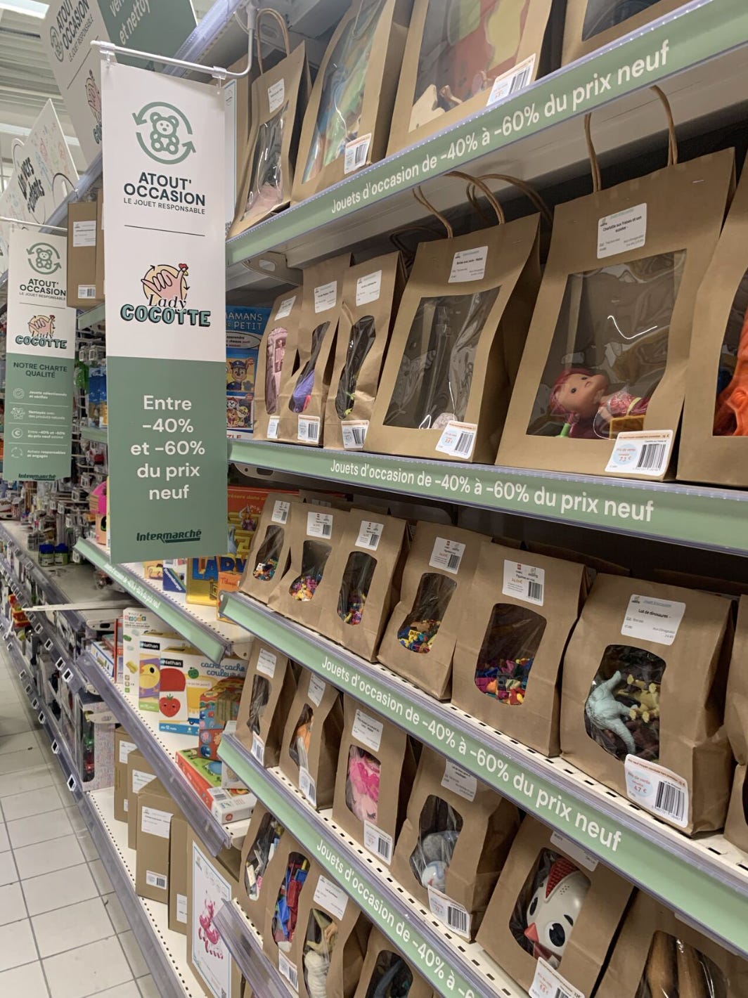 Qui aurait pu imaginer, il y a encore quelques années, que l’on retrouverait dans les temples de la grande conso, des produits d’occasion ? Dans les rayons de certains Intermarché ou encore chez Cultura, JOUGA installe désormais ses jouets soigneusement sélectionnés et nettoyés dans des petits packaging en kraft. Les jouets d’occasion côtoient désormais les jouets neufs dans les grandes surfaces. Et c’est la même chez les acteurs majeurs de l’industrie qui ont aussi pris le virage de l’occasion. Par simple opportunisme de marché ou réels engagements RSE ? “Dans tous les cas, cela va dans le bon sens de la démocratisation du marché !” se félicite Laura Bos. King Jouet a ainsi lancé son offre King Okaz dans une partie de ses magasins, tout comme Joué Club avec Troc O'Joué. Chez KIDIBAM, on voit aussi les commandes des grandes enseignes se renouveler, signe du dynamisme du marché.
